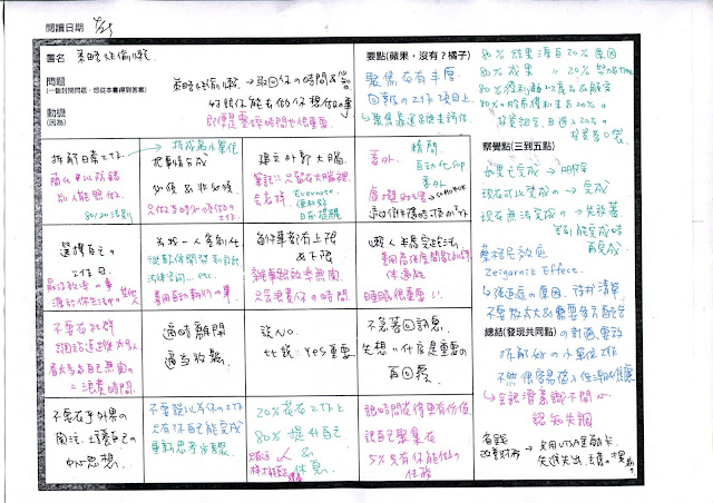 2.建立外部大腦,不要把所有東西都留在大腦裡,使用Evernote、便利貼、日曆行事曆提醒都可以(這本介紹了一些方便好用的軟體,像是行事曆可以訂鬧鐘,提醒自己該做什麼事,不過這些都有更多類似功能的app可以取代了)